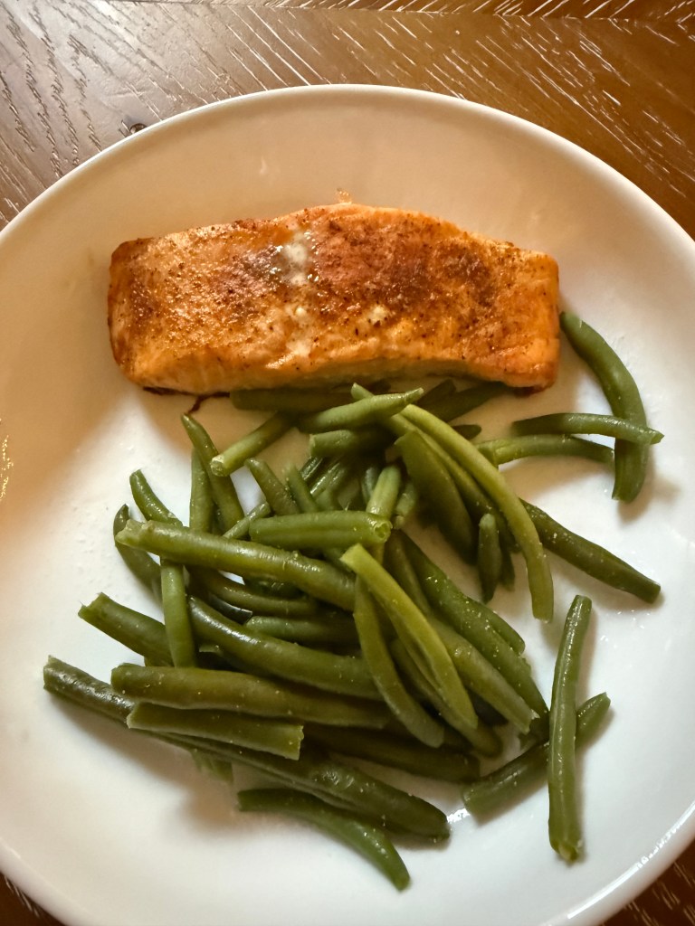 The drive back home wound through town and I was so hungry after our five mile walk. Every fast food place looked enticing. I told K that it would be great to go to Dairy Queen and pick up some food on the way home. While Dairy Queen would have been delicious, it was not a healthy choice. Instead, we came home, and I made Atlantic salmon and green beans with lemon juice.